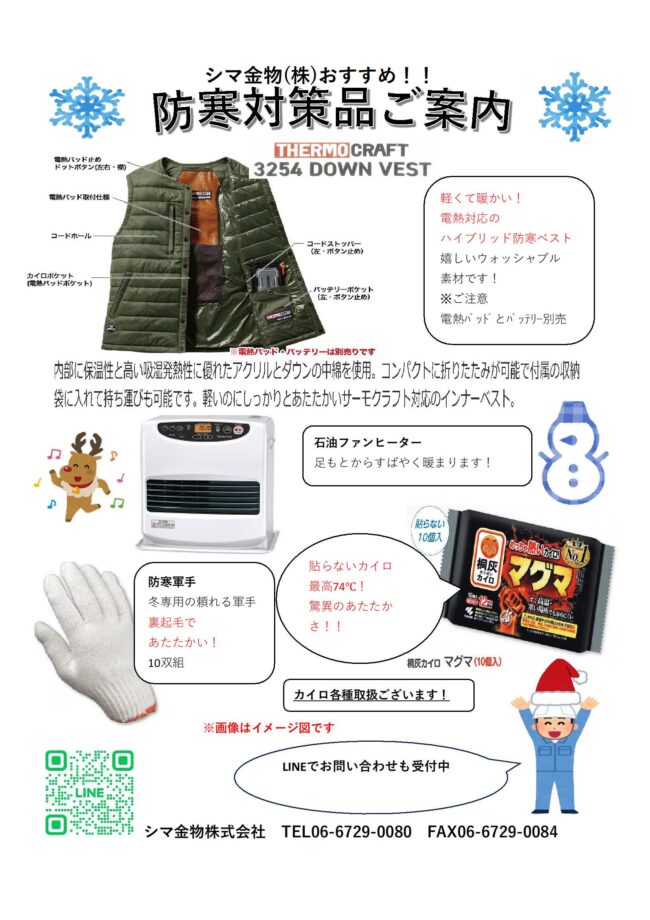 防寒対策品ご案内 2025年11月14日 最終更新日時 : 2025年11月14日 シマ金物株式会社 おすすめの防寒対策品をご案内させていただきます(^^♪ 暖かくして冬を快適に乗り切りましょう(^^)/